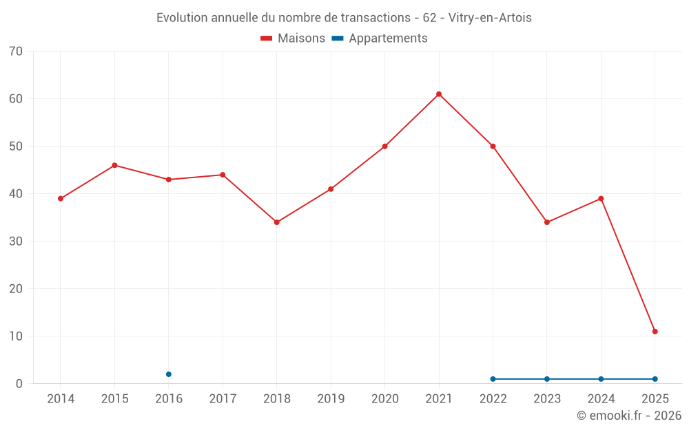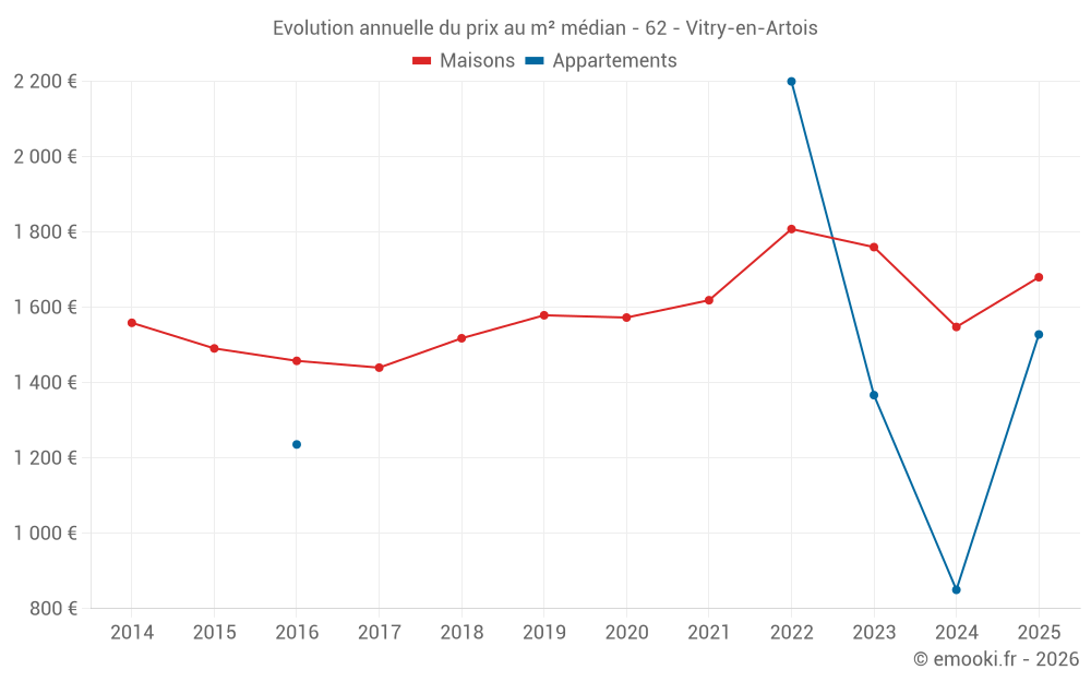 Le prix médian sur les 32 transactions de maisons des 12 derniers mois dans la commune de Vitry-en-Artois était de 1 704 € par mètre carré pour une valeur foncière médiane de 151 250 €. Sur cette période 60% des transactions se sont situées entre 969 et 2 116 € par mètre carré (du 2ème au 8ème déciles).