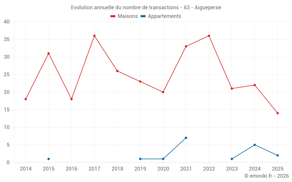 Le prix médian sur les 36 transactions de maisons des 24 derniers mois dans la commune d'Aigueperse était de 1 534 € par mètre carré pour une valeur foncière médiane de 128 300 €. Sur cette période 60% des transactions se sont situées entre 935 et 2 380 € par mètre carré (du 2ème au 8ème déciles).