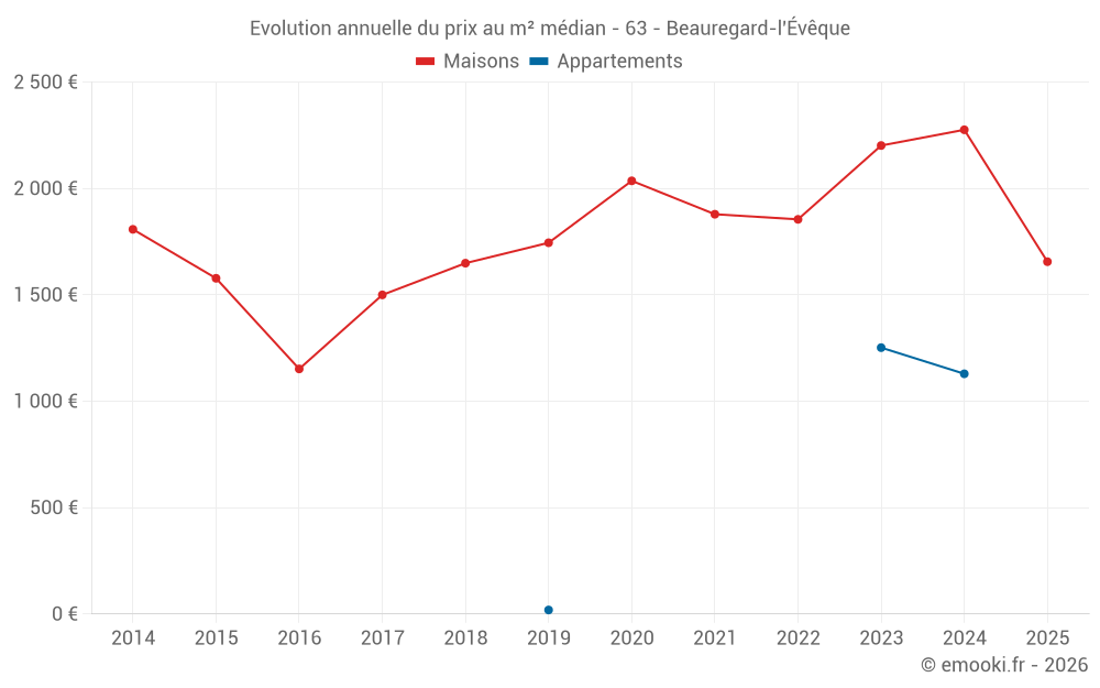 Le prix médian sur les 17 transactions de maisons des 24 derniers mois dans la commune de Beauregard-l'Évêque était de 2 248 € par mètre carré pour une valeur foncière médiane de 166 750 €. Sur cette période 60% des transactions se sont situées entre 1 588 et 2 750 € par mètre carré (du 2ème au 8ème déciles).
