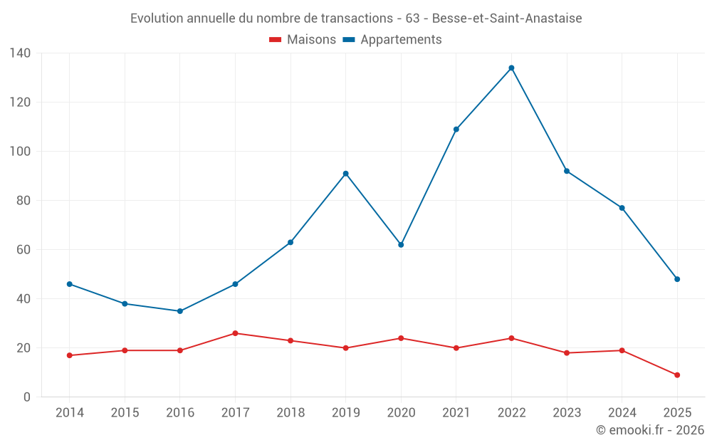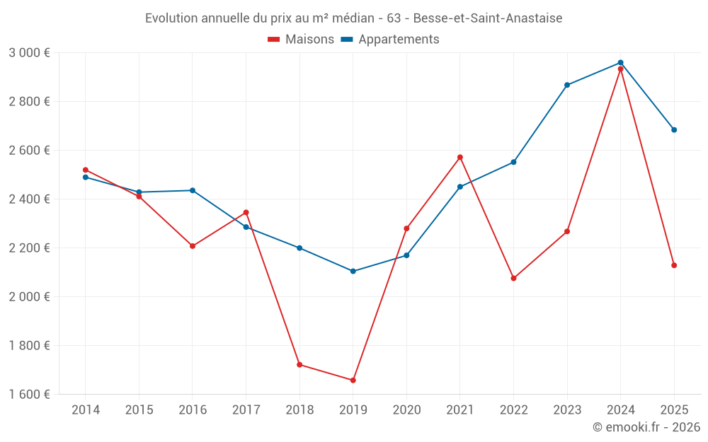 Le prix médian sur les 23 transactions de maisons des 12 derniers mois dans la commune de Besse-et-Saint-Anastaise était de 2 701 € par mètre carré pour une valeur foncière médiane de 219 040 €. Sur cette période 60% des transactions se sont situées entre 1 815 et 4 231 € par mètre carré (du 2ème au 8ème déciles).