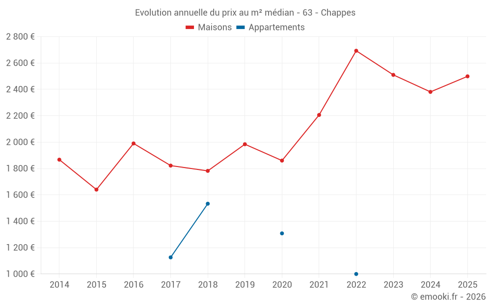 Le prix médian sur les 27 transactions de maisons des 24 derniers mois dans la commune de Chappes était de 2 482 € par mètre carré pour une valeur foncière médiane de 255 850 €. Sur cette période 60% des transactions se sont situées entre 1 964 et 2 754 € par mètre carré (du 2ème au 8ème déciles).