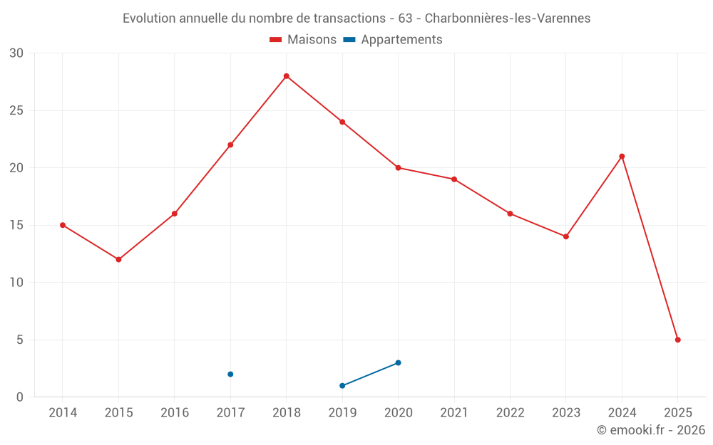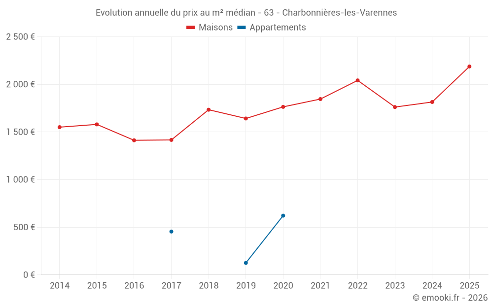 Le prix médian sur les 21 transactions de maisons des 12 derniers mois dans la commune de Charbonnières-les-Varennes était de 1 846 € par mètre carré pour une valeur foncière médiane de 190 200 €. Sur cette période 60% des transactions se sont situées entre 1 500 et 2 554 € par mètre carré (du 2ème au 8ème déciles).