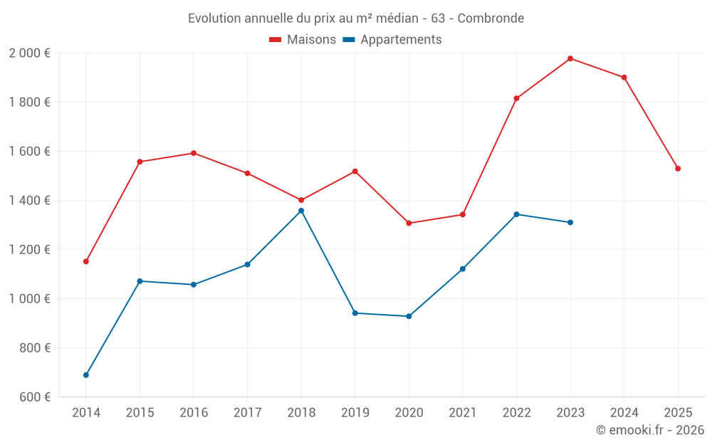 Le prix médian sur les 30 transactions de maisons des 12 derniers mois dans la commune de Combronde était de 1 576 € par mètre carré pour une valeur foncière médiane de 119 650 €. Sur cette période 60% des transactions se sont situées entre 854 et 2 205 € par mètre carré (du 2ème au 8ème déciles).