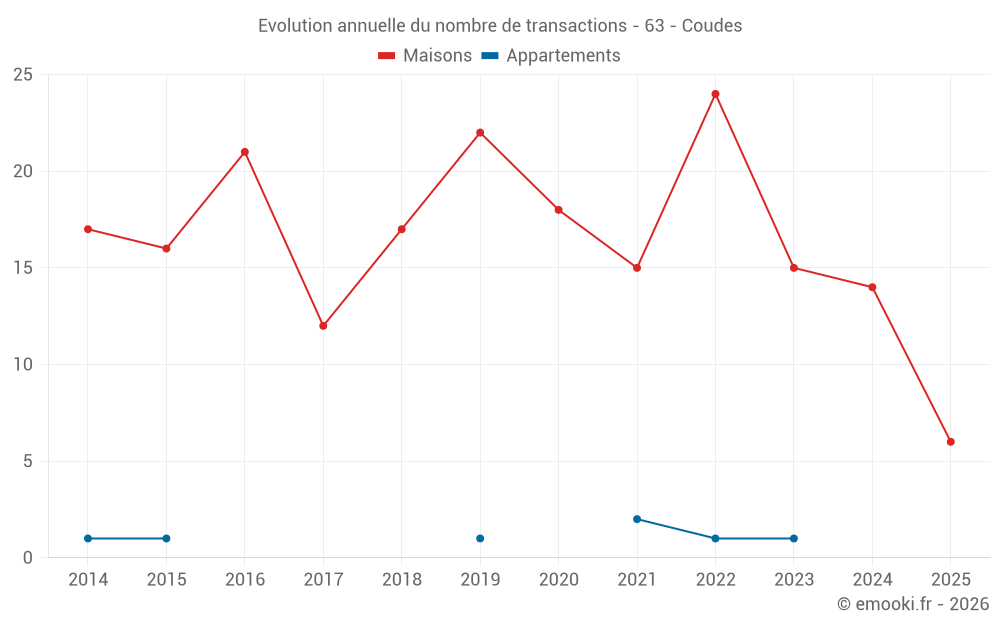 Le prix médian sur les 27 transactions de maisons des 24 derniers mois dans la commune de Coudes était de 2 054 € par mètre carré pour une valeur foncière médiane de 147 850 €. Sur cette période 60% des transactions se sont situées entre 1 337 et 2 556 € par mètre carré (du 2ème au 8ème déciles).
