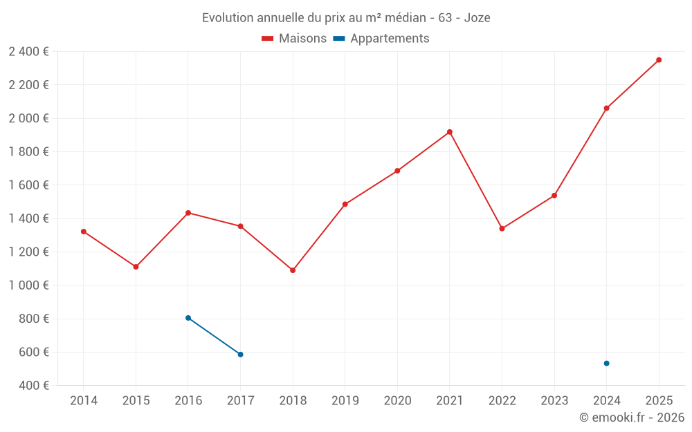 Le prix médian sur les 18 transactions de maisons des 24 derniers mois dans la commune de Joze était de 1 821 € par mètre carré pour une valeur foncière médiane de 149 450 €. Sur cette période 60% des transactions se sont situées entre 1 115 et 2 351 € par mètre carré (du 2ème au 8ème déciles).