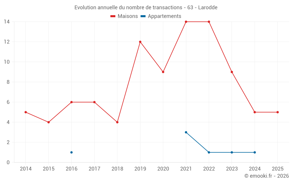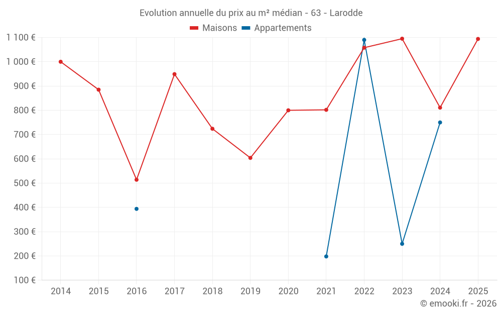 Le prix médian sur les 14 transactions de maisons des 24 derniers mois dans la commune de Larodde était de 1 115 € par mètre carré pour une valeur foncière médiane de 91 325 €. Sur cette période 60% des transactions se sont situées entre 654 et 1 341 € par mètre carré (du 2ème au 8ème déciles).
