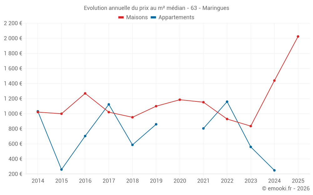 Le prix médian sur les 26 transactions de maisons des 12 derniers mois dans la commune de Maringues était de 1 481 € par mètre carré pour une valeur foncière médiane de 139 712 €. Sur cette période 60% des transactions se sont situées entre 515 et 2 355 € par mètre carré (du 2ème au 8ème déciles).