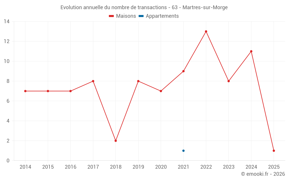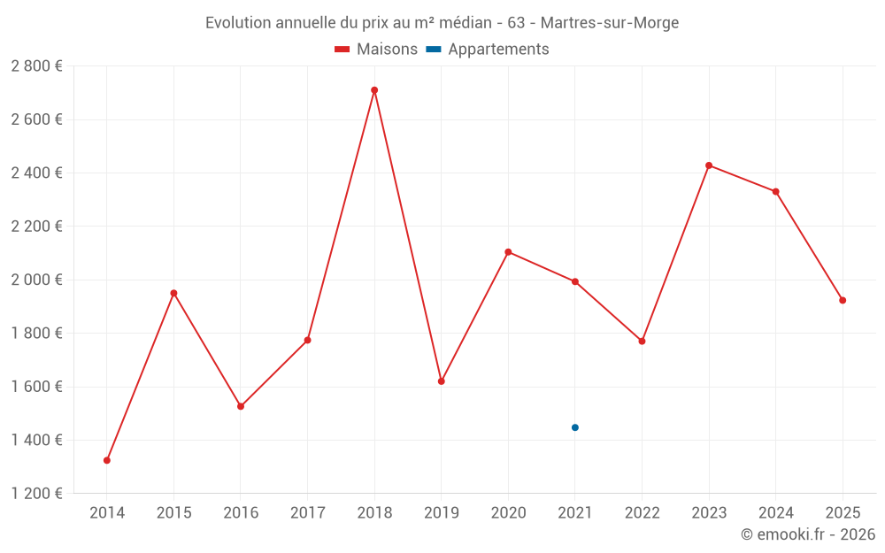 Le prix médian sur les 15 transactions de maisons des 24 derniers mois dans la commune de Martres-sur-Morge était de 2 330 € par mètre carré pour une valeur foncière médiane de 233 600 €. Sur cette période 60% des transactions se sont situées entre 1 875 et 2 968 € par mètre carré (du 2ème au 8ème déciles).