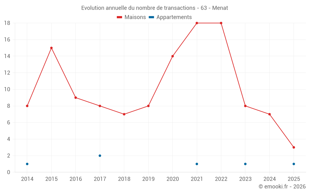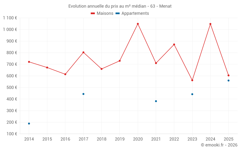 Le prix médian sur les 15 transactions de maisons des 24 derniers mois dans la commune de Menat était de 669 € par mètre carré pour une valeur foncière médiane de 95 000 €. Sur cette période 60% des transactions se sont situées entre 465 et 1 481 € par mètre carré (du 2ème au 8ème déciles).