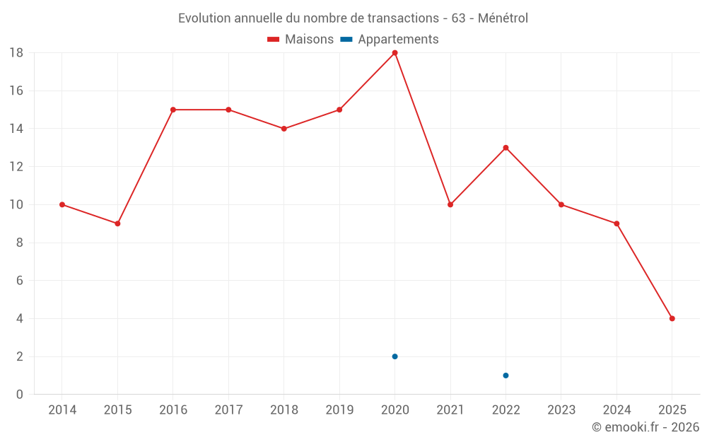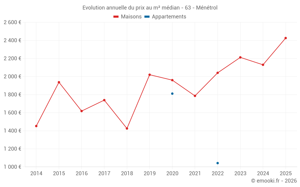 Le prix médian sur les 17 transactions de maisons des 24 derniers mois dans la commune de Ménétrol était de 2 130 € par mètre carré pour une valeur foncière médiane de 195 000 €. Sur cette période 60% des transactions se sont situées entre 1 502 et 2 607 € par mètre carré (du 2ème au 8ème déciles).