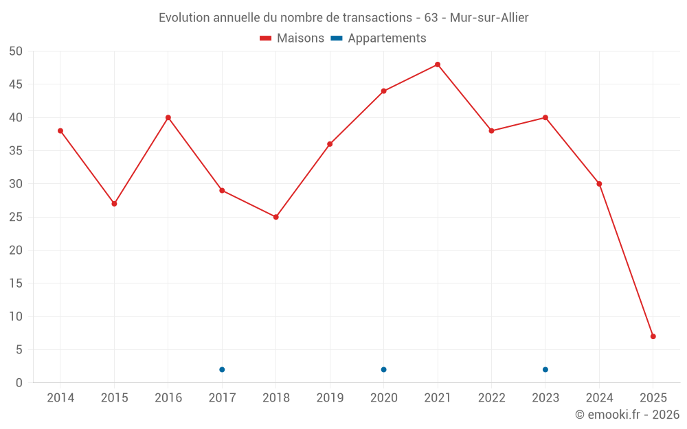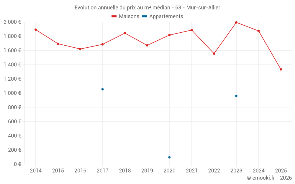Le prix médian sur les 22 transactions de maisons des 12 derniers mois dans la commune de Mur-sur-Allier était de 1 878 € par mètre carré pour une valeur foncière médiane de 157 880 €. Sur cette période 60% des transactions se sont situées entre 1 196 et 2 506 € par mètre carré (du 2ème au 8ème déciles).