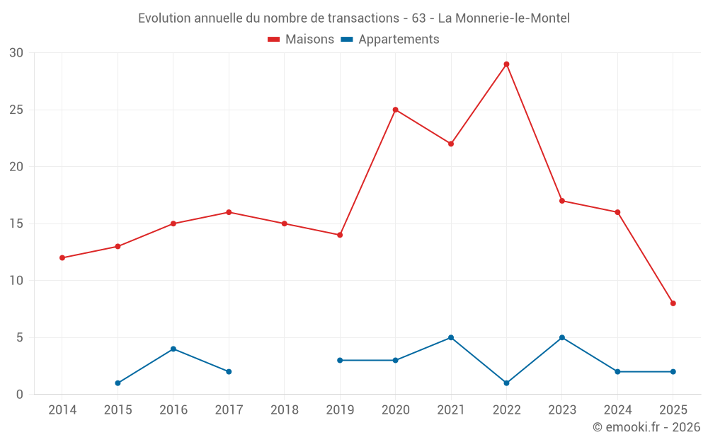 Le prix médian sur les 17 transactions de maisons des 12 derniers mois dans la commune de la Monnerie-le-Montel était de 700 € par mètre carré pour une valeur foncière médiane de 63 200 €. Sur cette période 60% des transactions se sont situées entre 352 et 1 275 € par mètre carré (du 2ème au 8ème déciles).