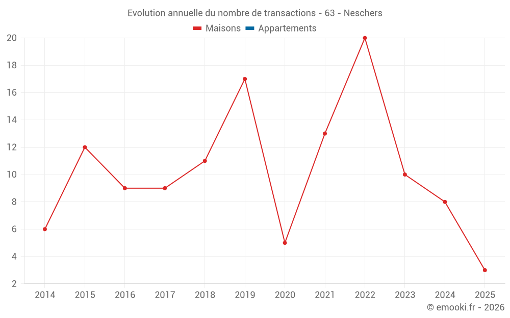 Le prix médian sur les 15 transactions de maisons des 24 derniers mois dans la commune de Neschers était de 1 685 € par mètre carré pour une valeur foncière médiane de 123 000 €. Sur cette période 60% des transactions se sont situées entre 995 et 2 201 € par mètre carré (du 2ème au 8ème déciles).