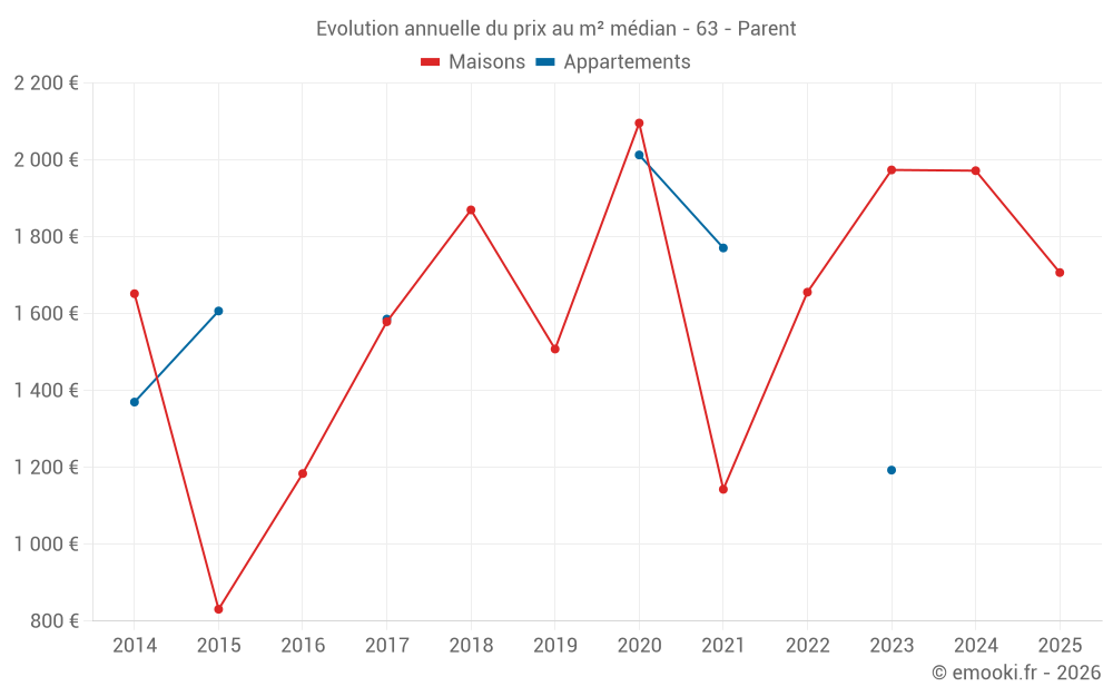 Le prix médian sur les 26 transactions de maisons des 24 derniers mois dans la commune de Parent était de 1 858 € par mètre carré pour une valeur foncière médiane de 146 500 €. Sur cette période 60% des transactions se sont situées entre 1 318 et 2 630 € par mètre carré (du 2ème au 8ème déciles).