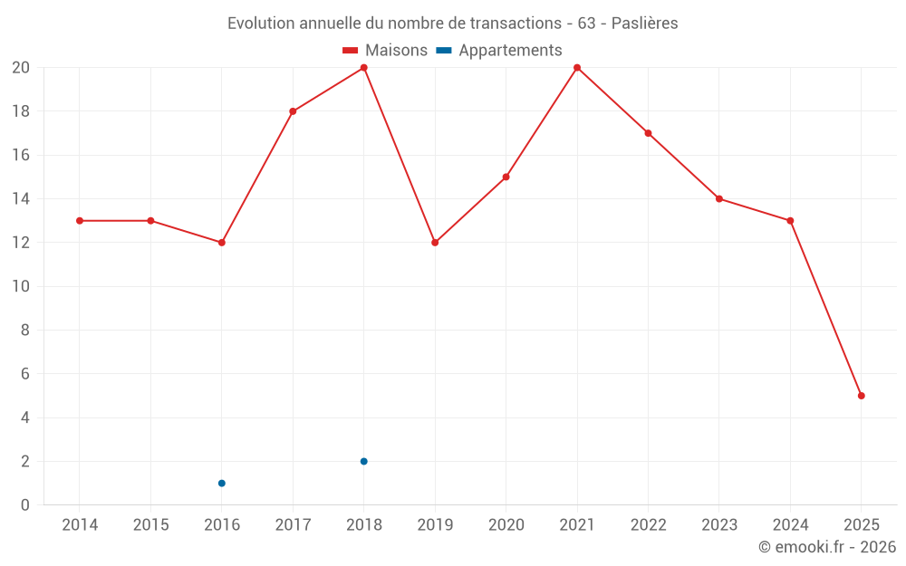 Le prix médian sur les 27 transactions de maisons des 24 derniers mois dans la commune de Paslières était de 1 302 € par mètre carré pour une valeur foncière médiane de 125 000 €. Sur cette période 60% des transactions se sont situées entre 590 et 2 056 € par mètre carré (du 2ème au 8ème déciles).