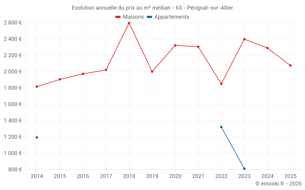 Le prix médian sur les 23 transactions de maisons des 24 derniers mois dans la commune de Pérignat-sur-Allier était de 2 185 € par mètre carré pour une valeur foncière médiane de 227 500 €. Sur cette période 60% des transactions se sont situées entre 1 694 et 2 727 € par mètre carré (du 2ème au 8ème déciles).
