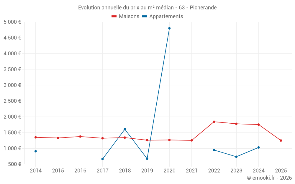 Le prix médian sur les 19 transactions de maisons des 24 derniers mois dans la commune de Picherande était de 1 754 € par mètre carré pour une valeur foncière médiane de 133 010 €. Sur cette période 60% des transactions se sont situées entre 532 et 2 877 € par mètre carré (du 2ème au 8ème déciles).