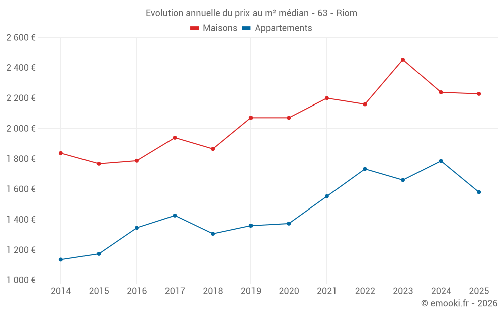 Le prix médian sur les 23 transactions de maisons des 3 derniers mois dans la commune de Riom était de 2 133 € par mètre carré pour une valeur foncière médiane de 231 740 €. Sur cette période 60% des transactions se sont situées entre 1 566 et 2 911 € par mètre carré (du 2ème au 8ème déciles).