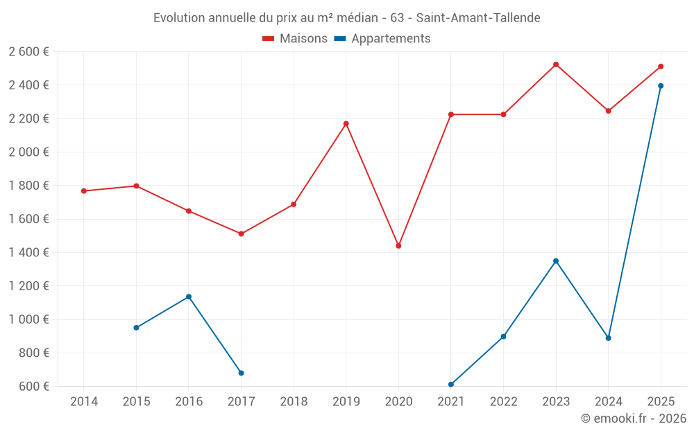 Le prix médian sur les 16 transactions de maisons des 12 derniers mois dans la commune de Saint-Amant-Tallende était de 2 314 € par mètre carré pour une valeur foncière médiane de 242 250 €. Sur cette période 60% des transactions se sont situées entre 1 003 et 2 753 € par mètre carré (du 2ème au 8ème déciles).
