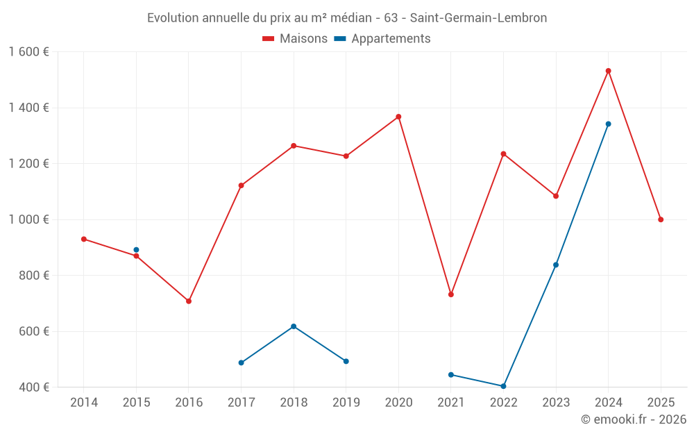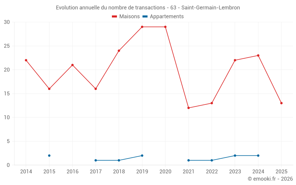 Le prix médian sur les 24 transactions de maisons des 12 derniers mois dans la commune de Saint-Germain-Lembron était de 1 041 € par mètre carré pour une valeur foncière médiane de 136 675 €. Sur cette période 60% des transactions se sont situées entre 685 et 1 940 € par mètre carré (du 2ème au 8ème déciles).