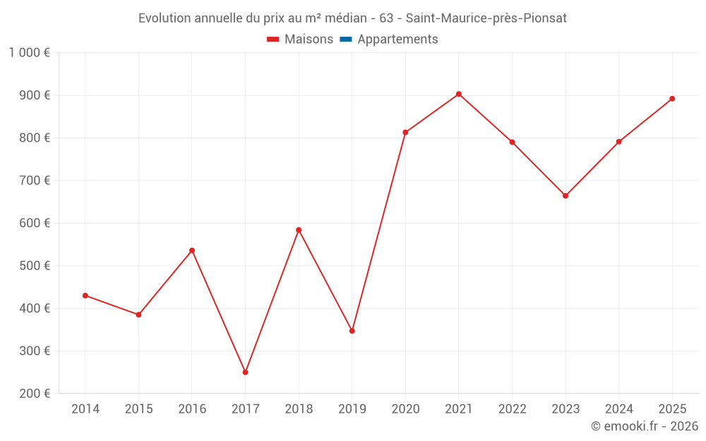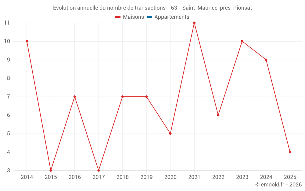 Le prix médian sur les 19 transactions de maisons des 24 derniers mois dans la commune de Saint-Maurice-près-Pionsat était de 802 € par mètre carré pour une valeur foncière médiane de 69 000 €. Sur cette période 60% des transactions se sont situées entre 322 et 1 137 € par mètre carré (du 2ème au 8ème déciles).