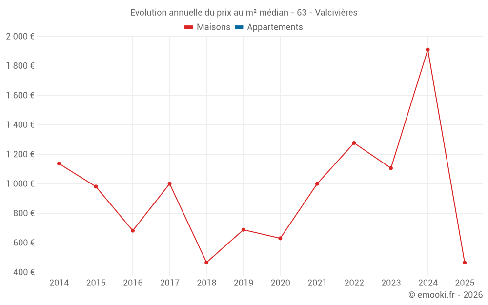 Le prix médian sur les 20 transactions de maisons des 24 derniers mois dans la commune de Valcivières était de 1 106 € par mètre carré pour une valeur foncière médiane de 101 500 €. Sur cette période 60% des transactions se sont situées entre 650 et 1 767 € par mètre carré (du 2ème au 8ème déciles).