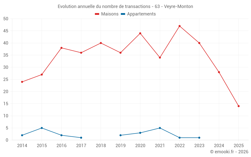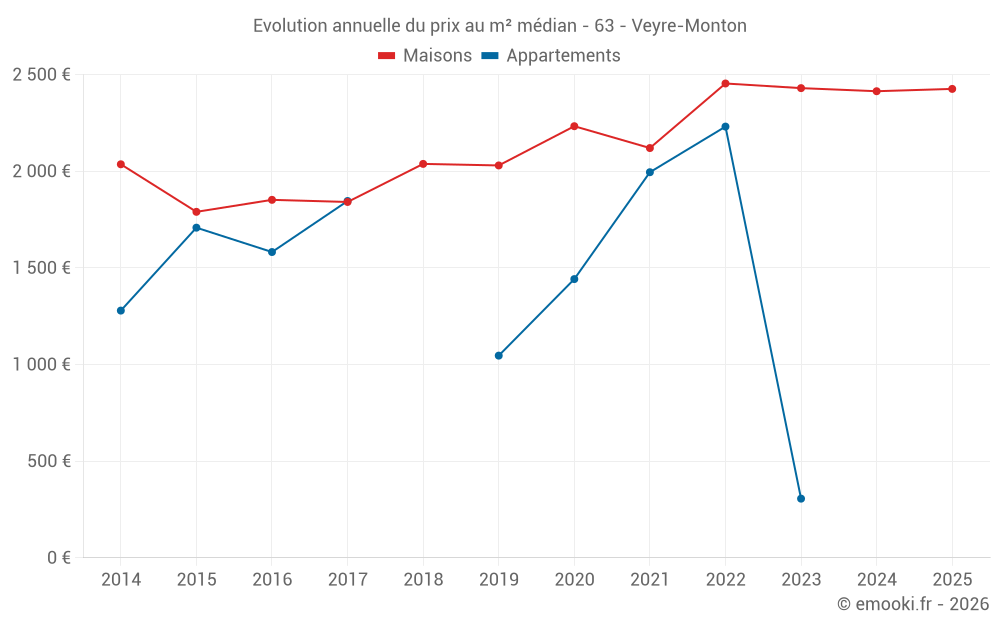 Le prix médian sur les 31 transactions de maisons des 12 derniers mois dans la commune de Veyre-Monton était de 2 388 € par mètre carré pour une valeur foncière médiane de 250 000 €. Sur cette période 60% des transactions se sont situées entre 1 297 et 3 051 € par mètre carré (du 2ème au 8ème déciles).