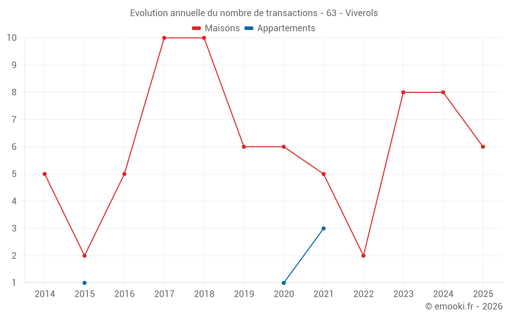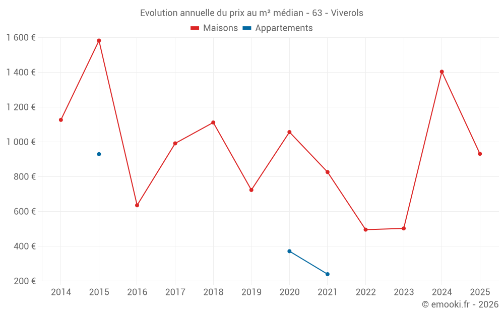 Le prix médian sur les 16 transactions de maisons des 24 derniers mois dans la commune de Viverols était de 1 296 € par mètre carré pour une valeur foncière médiane de 110 250 €. Sur cette période 60% des transactions se sont situées entre 417 et 1 747 € par mètre carré (du 2ème au 8ème déciles).