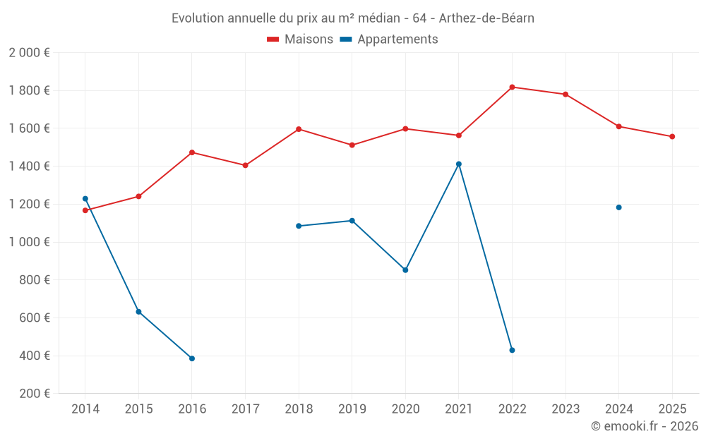 Le prix médian sur les 16 transactions de maisons des 12 derniers mois dans la commune d'Arthez-de-Béarn était de 1 534 € par mètre carré pour une valeur foncière médiane de 210 510 €. Sur cette période 60% des transactions se sont situées entre 1 194 et 2 245 € par mètre carré (du 2ème au 8ème déciles).