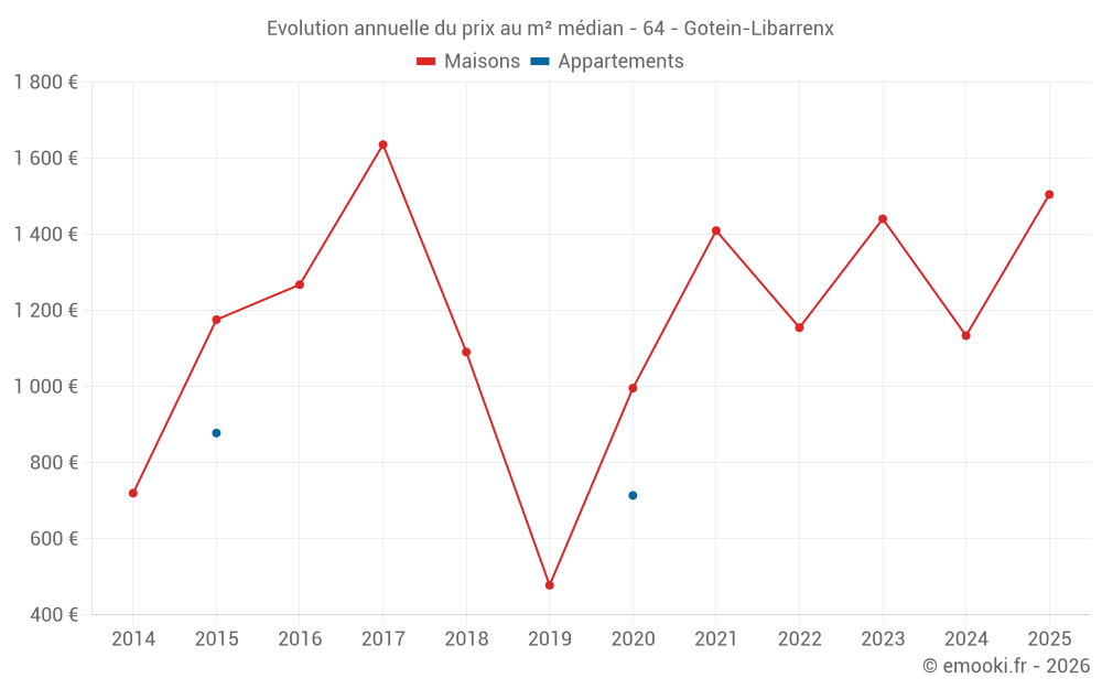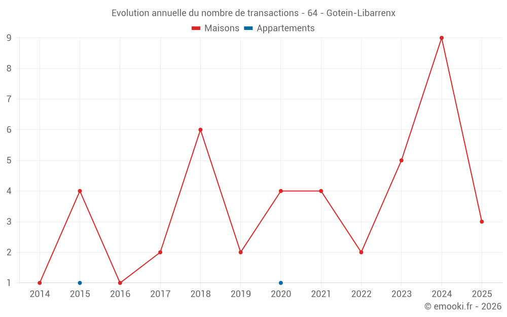 Le prix médian sur les 16 transactions de maisons des 24 derniers mois dans la commune de Gotein-Libarrenx était de 1 314 € par mètre carré pour une valeur foncière médiane de 133 000 €. Sur cette période 60% des transactions se sont situées entre 817 et 1 894 € par mètre carré (du 2ème au 8ème déciles).