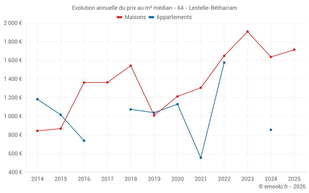 Le prix médian sur les 14 transactions de maisons des 24 derniers mois dans la commune de Lestelle-Bétharram était de 1 802 € par mètre carré pour une valeur foncière médiane de 190 388 €. Sur cette période 60% des transactions se sont situées entre 1 261 et 2 148 € par mètre carré (du 2ème au 8ème déciles).