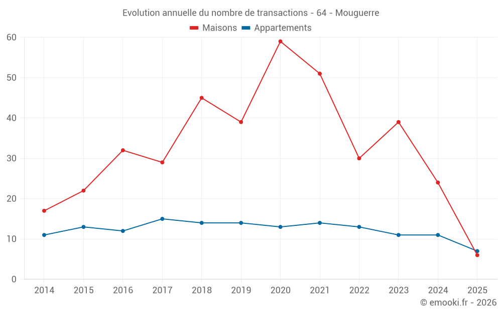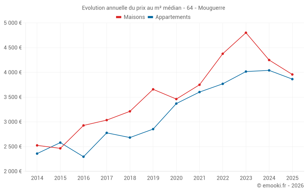 Le prix médian sur les 24 transactions de maisons des 12 derniers mois dans la commune de Mouguerre était de 4 010 € par mètre carré pour une valeur foncière médiane de 485 500 €. Sur cette période 60% des transactions se sont situées entre 2 991 et 4 992 € par mètre carré (du 2ème au 8ème déciles).