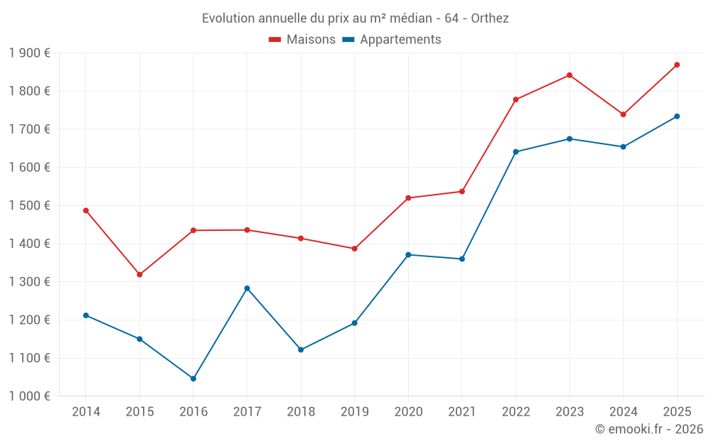 Le prix médian sur les 39 transactions de maisons des 6 derniers mois dans la commune d'Orthez était de 1 869 € par mètre carré pour une valeur foncière médiane de 179 000 €. Sur cette période 60% des transactions se sont situées entre 1 170 et 2 235 € par mètre carré (du 2ème au 8ème déciles).
