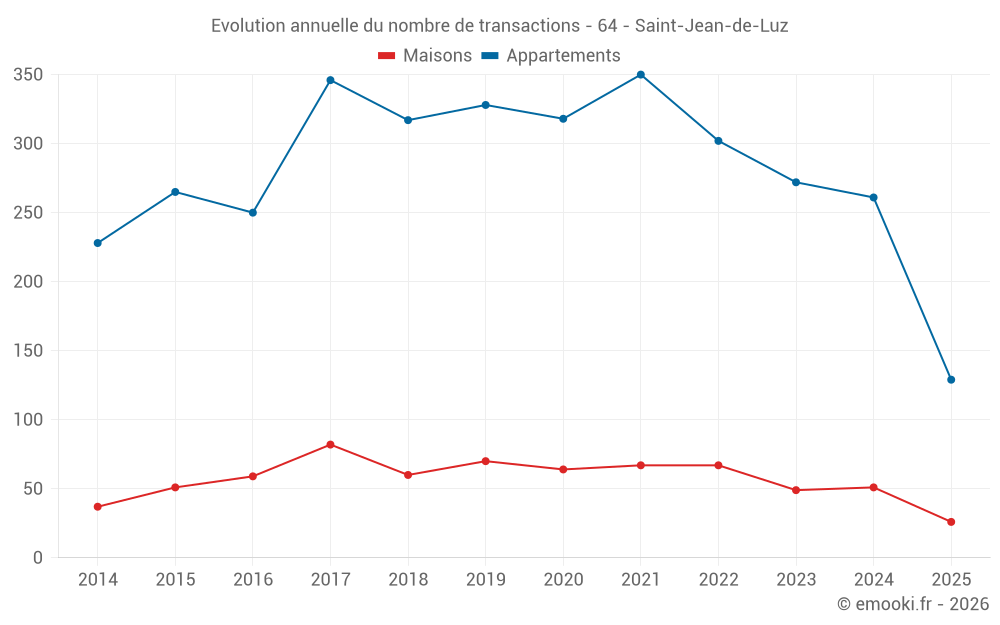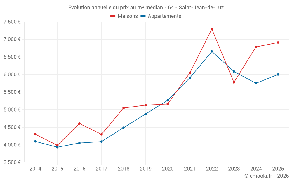 Le prix médian sur les 26 transactions de maisons des 6 derniers mois dans la commune de Saint-Jean-de-Luz était de 6 909 € par mètre carré pour une valeur foncière médiane de 734 000 €. Sur cette période 60% des transactions se sont situées entre 3 683 et 8 864 € par mètre carré (du 2ème au 8ème déciles).