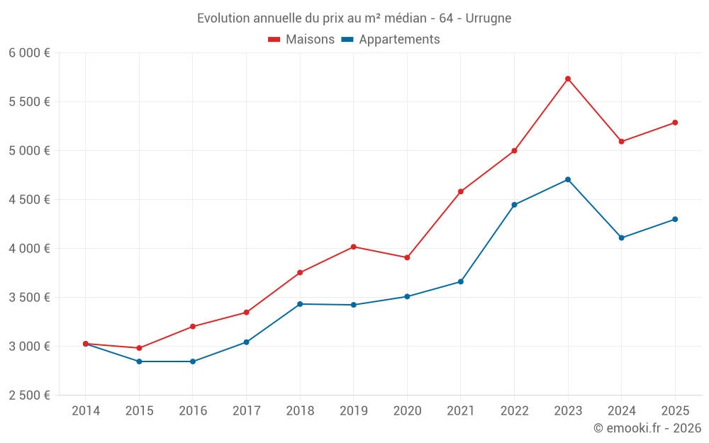 Le prix médian sur les 22 transactions de maisons des 6 derniers mois dans la commune d'Urrugne était de 5 288 € par mètre carré pour une valeur foncière médiane de 592 500 €. Sur cette période 60% des transactions se sont situées entre 4 370 et 8 090 € par mètre carré (du 2ème au 8ème déciles).