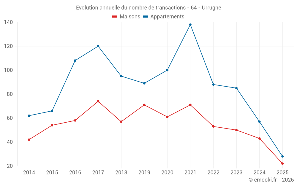 Le prix médian sur les 28 transactions d'appartements des 6 derniers mois dans la commune d'Urrugne était de 4 300 € par mètre carré pour une valeur foncière médiane de 257 750 €. Sur cette période 60% des transactions se sont situées entre 3 319 et 5 524 € par mètre carré (du 2ème au 8ème déciles).
