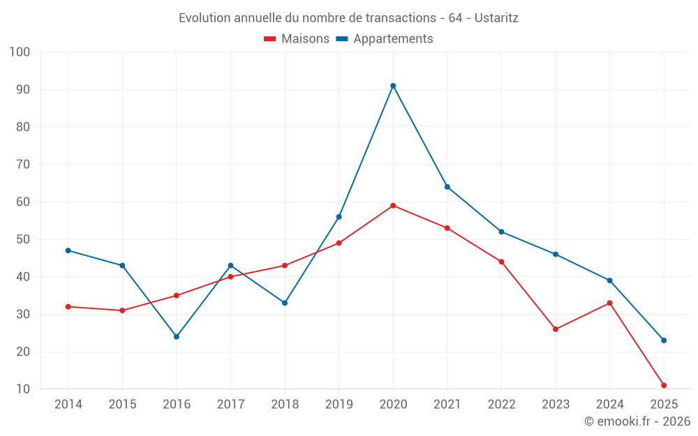 Le prix médian sur les 30 transactions de maisons des 12 derniers mois dans la commune d'Ustaritz était de 4 195 € par mètre carré pour une valeur foncière médiane de 450 400 €. Sur cette période 60% des transactions se sont situées entre 3 743 et 4 737 € par mètre carré (du 2ème au 8ème déciles).