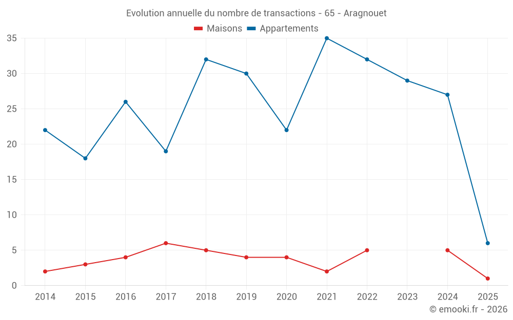 Le prix médian sur les 20 transactions d'appartements des 12 derniers mois dans la commune d'Aragnouet était de 2 768 € par mètre carré pour une valeur foncière médiane de 83 390 €. Sur cette période 60% des transactions se sont situées entre 1 936 et 3 142 € par mètre carré (du 2ème au 8ème déciles).