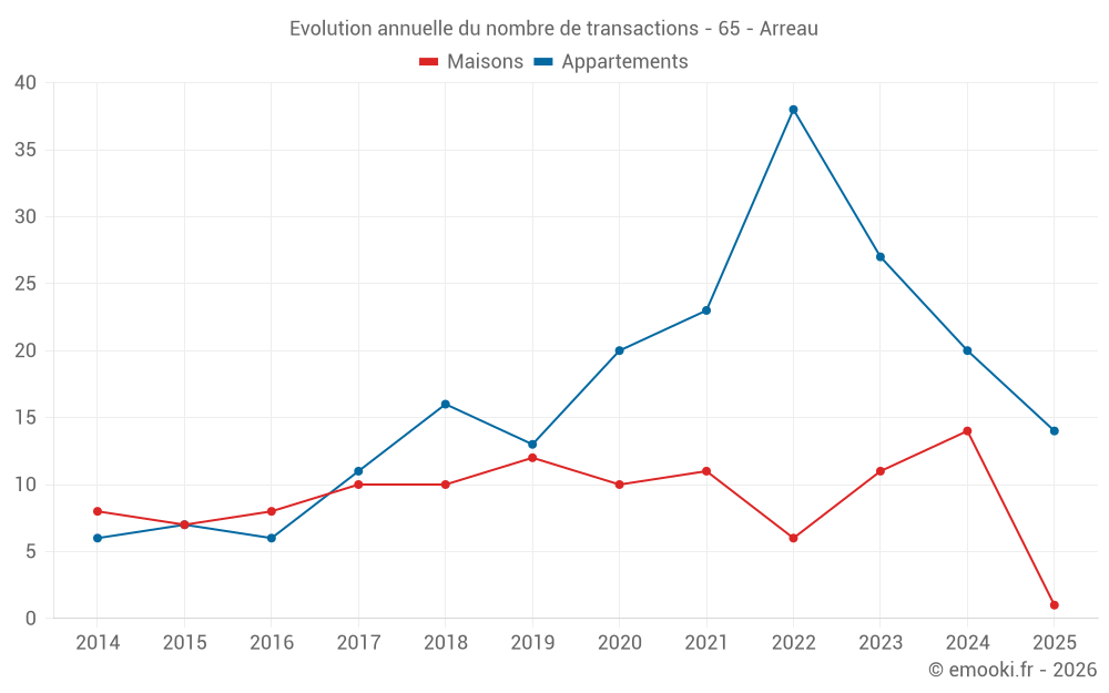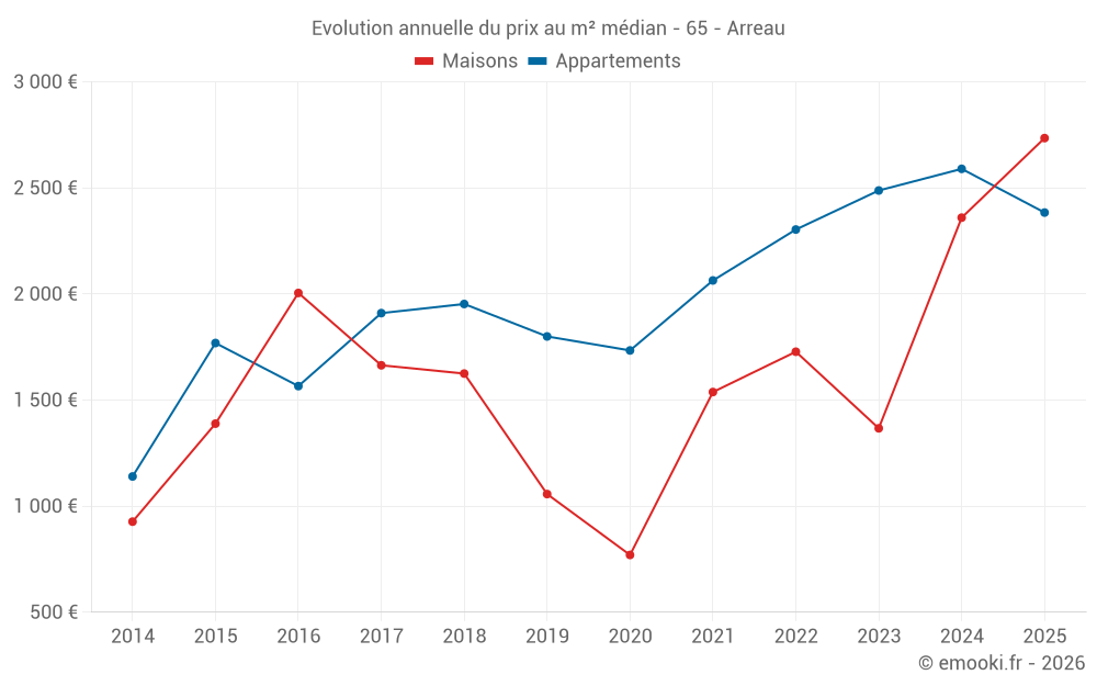 Le prix médian sur les 20 transactions de maisons des 24 derniers mois dans la commune d'Arreau était de 2 360 € par mètre carré pour une valeur foncière médiane de 190 000 €. Sur cette période 60% des transactions se sont situées entre 1 326 et 2 819 € par mètre carré (du 2ème au 8ème déciles).