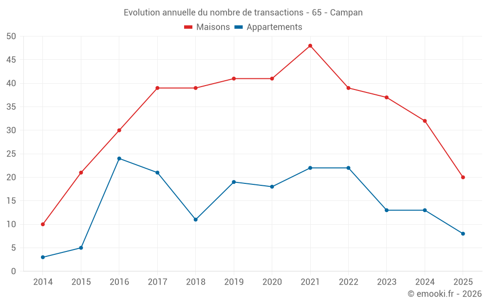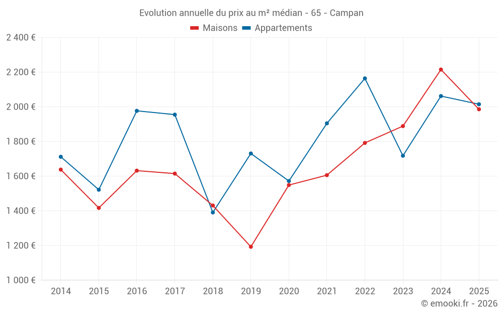 Le prix médian sur les 20 transactions de maisons des 6 derniers mois dans la commune de Campan était de 1 986 € par mètre carré pour une valeur foncière médiane de 176 175 €. Sur cette période 60% des transactions se sont situées entre 1 448 et 2 566 € par mètre carré (du 2ème au 8ème déciles).