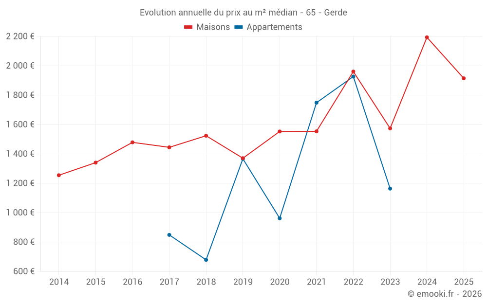 Le prix médian sur les 28 transactions de maisons des 24 derniers mois dans la commune de Gerde était de 1 896 € par mètre carré pour une valeur foncière médiane de 205 762 €. Sur cette période 60% des transactions se sont situées entre 1 451 et 2 599 € par mètre carré (du 2ème au 8ème déciles).