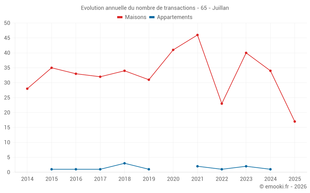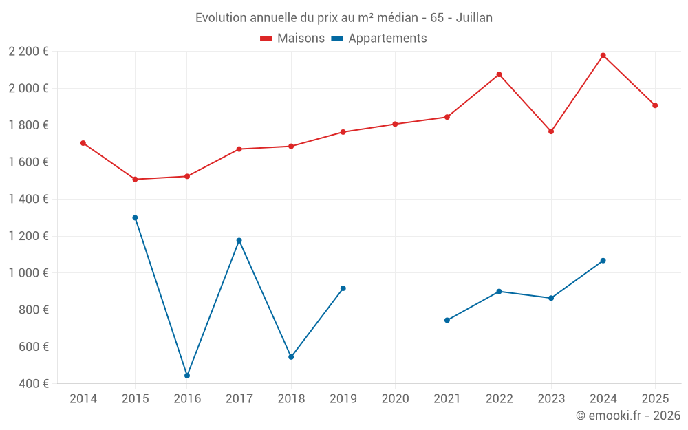 Le prix médian sur les 40 transactions de maisons des 12 derniers mois dans la commune de Juillan était de 1 994 € par mètre carré pour une valeur foncière médiane de 195 500 €. Sur cette période 60% des transactions se sont situées entre 1 648 et 2 449 € par mètre carré (du 2ème au 8ème déciles).