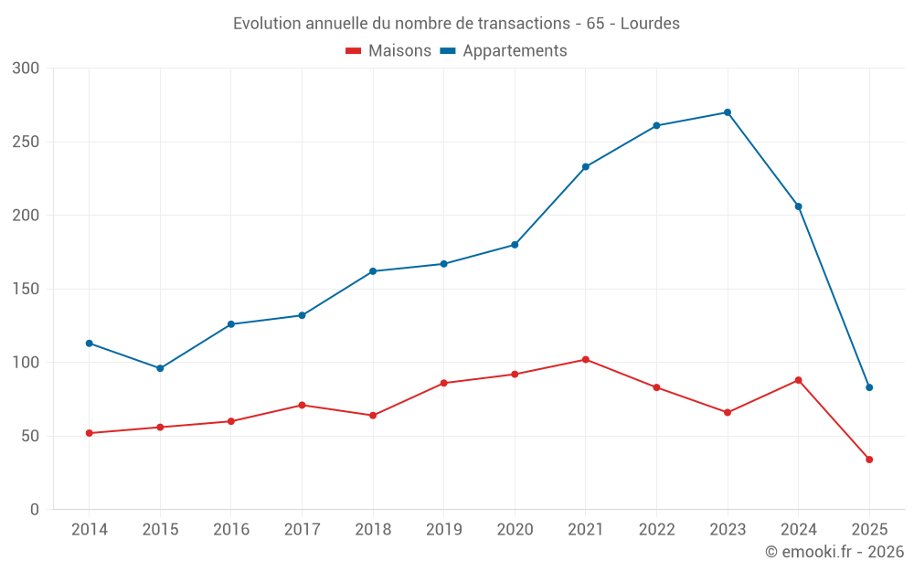 Le prix médian sur les 34 transactions de maisons des 6 derniers mois dans la commune de Lourdes était de 1 478 € par mètre carré pour une valeur foncière médiane de 171 700 €. Sur cette période 60% des transactions se sont situées entre 1 173 et 2 103 € par mètre carré (du 2ème au 8ème déciles).