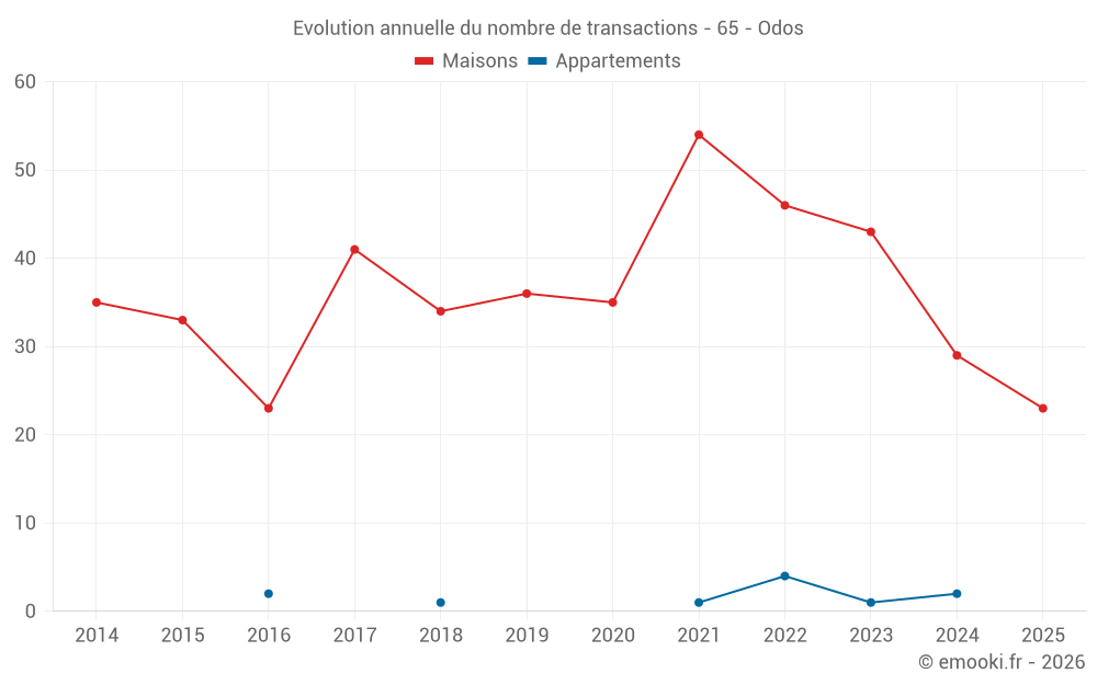 Le prix médian sur les 23 transactions de maisons des 6 derniers mois dans la commune d'Odos était de 1 986 € par mètre carré pour une valeur foncière médiane de 206 000 €. Sur cette période 60% des transactions se sont situées entre 1 483 et 2 386 € par mètre carré (du 2ème au 8ème déciles).