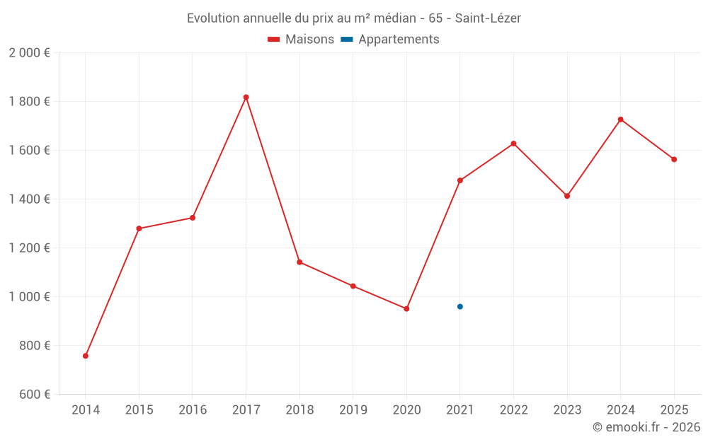 Le prix médian sur les 14 transactions de maisons des 24 derniers mois dans la commune de Saint-Lézer était de 1 736 € par mètre carré pour une valeur foncière médiane de 200 175 €. Sur cette période 60% des transactions se sont situées entre 1 155 et 2 039 € par mètre carré (du 2ème au 8ème déciles).