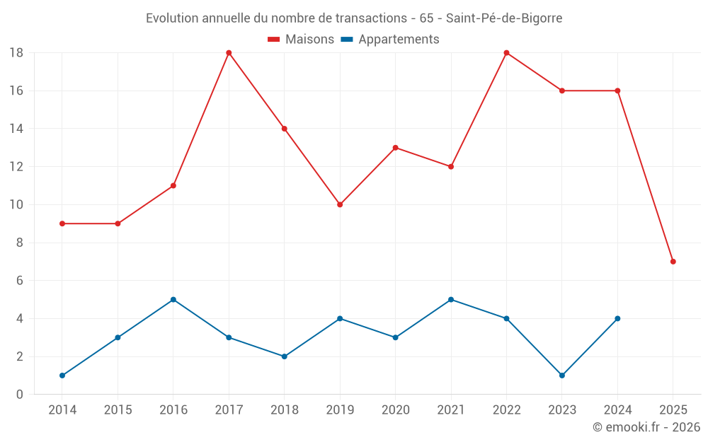 Le prix médian sur les 16 transactions de maisons des 12 derniers mois dans la commune de Saint-Pé-de-Bigorre était de 1 159 € par mètre carré pour une valeur foncière médiane de 122 825 €. Sur cette période 60% des transactions se sont situées entre 821 et 1 689 € par mètre carré (du 2ème au 8ème déciles).