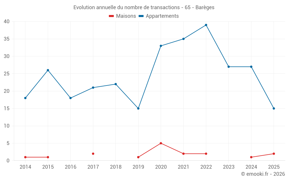 Le prix médian sur les 28 transactions d'appartements des 12 derniers mois dans la commune de Barèges était de 2 108 € par mètre carré pour une valeur foncière médiane de 66 150 €. Sur cette période 60% des transactions se sont situées entre 1 877 et 2 605 € par mètre carré (du 2ème au 8ème déciles).