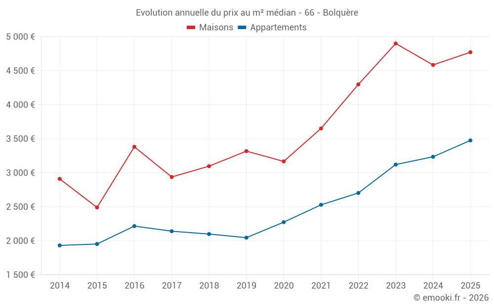 Le prix médian sur les 33 transactions de maisons des 12 derniers mois dans la commune de Bolquère était de 4 917 € par mètre carré pour une valeur foncière médiane de 266 000 €. Sur cette période 60% des transactions se sont situées entre 3 476 et 6 514 € par mètre carré (du 2ème au 8ème déciles).