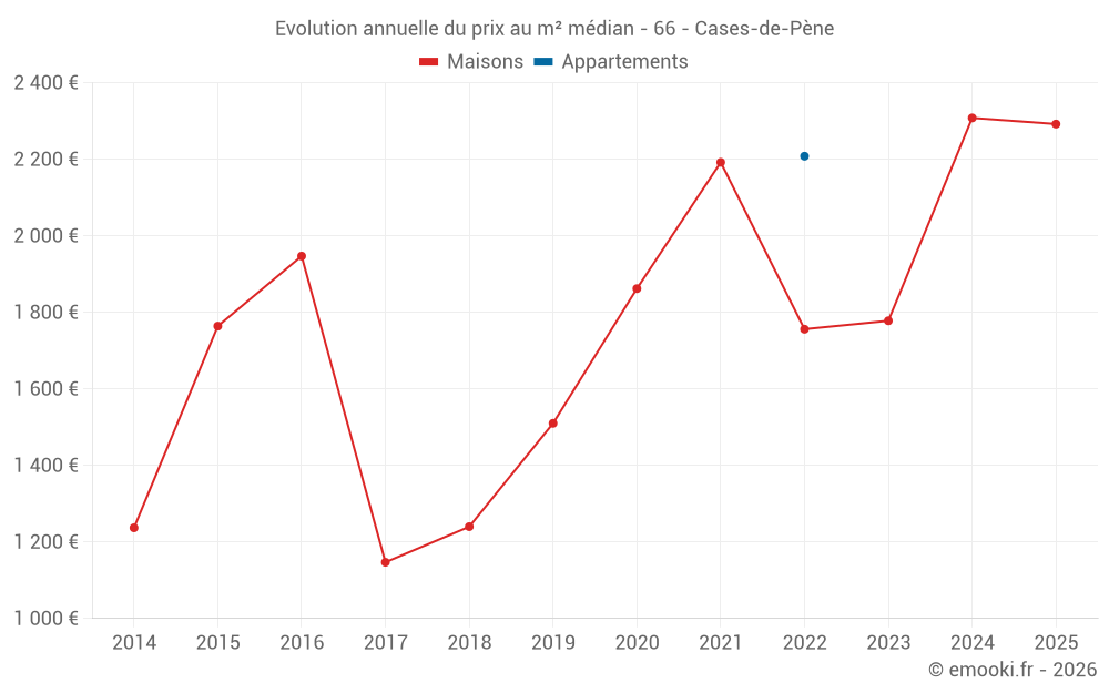 Le prix médian sur les 19 transactions de maisons des 24 derniers mois dans la commune de Cases-de-Pène était de 2 292 € par mètre carré pour une valeur foncière médiane de 150 000 €. Sur cette période 60% des transactions se sont situées entre 1 324 et 2 592 € par mètre carré (du 2ème au 8ème déciles).