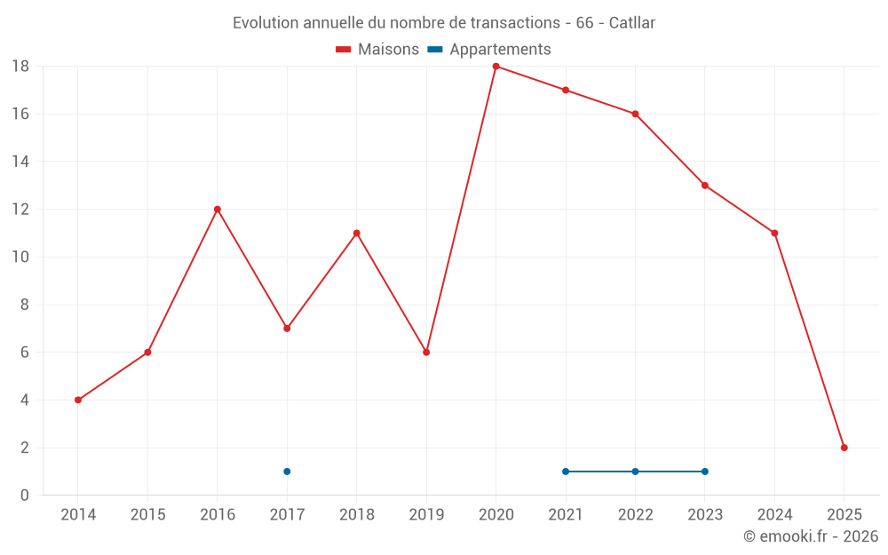 Le prix médian sur les 20 transactions de maisons des 24 derniers mois dans la commune de Catllar était de 2 074 € par mètre carré pour une valeur foncière médiane de 201 000 €. Sur cette période 60% des transactions se sont situées entre 1 339 et 2 597 € par mètre carré (du 2ème au 8ème déciles).